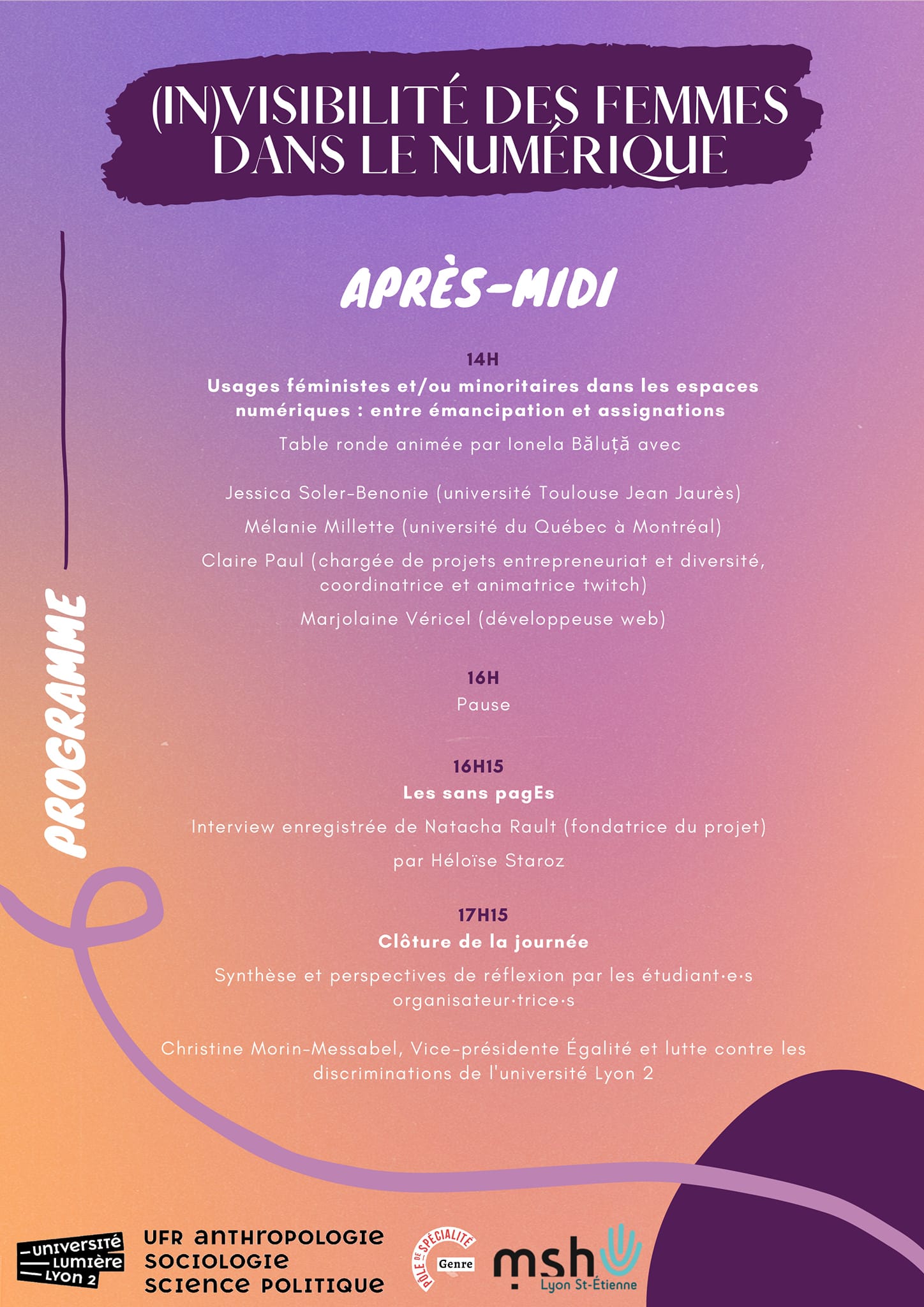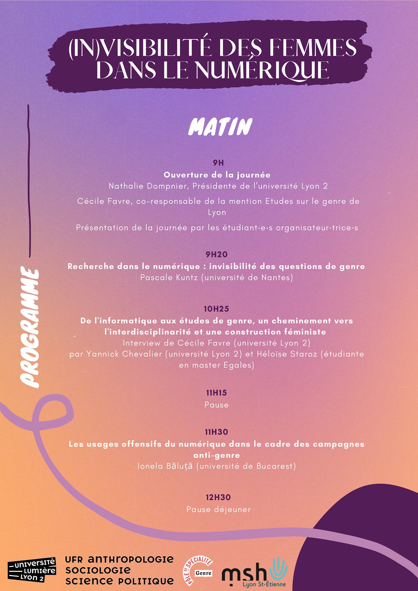 Dans le cadre de la onzième semaine intensive du réseau EGALES portant sur "genre et numérique" qui aura lieu du 16 au 20 mai, les étudiant.es des parcours EGALES, EGALITES, SEGO du master Etudes sur le Genre de l’université Lumière Lyon 2 ont le plaisir de vous convier lors de la journée du 18 mai à la Maison des Sciences de l’Homme, autour du thème de l'(In)visibilité des femmes dans le numérique.